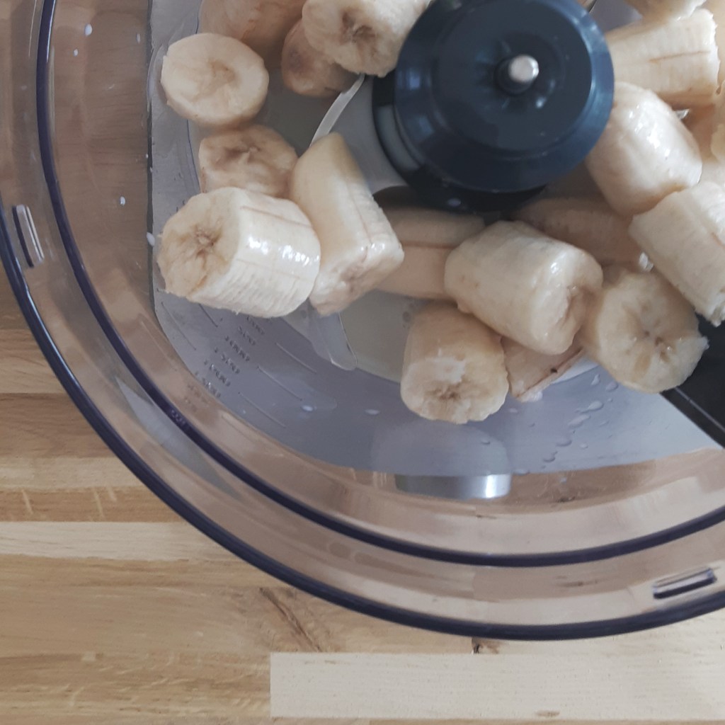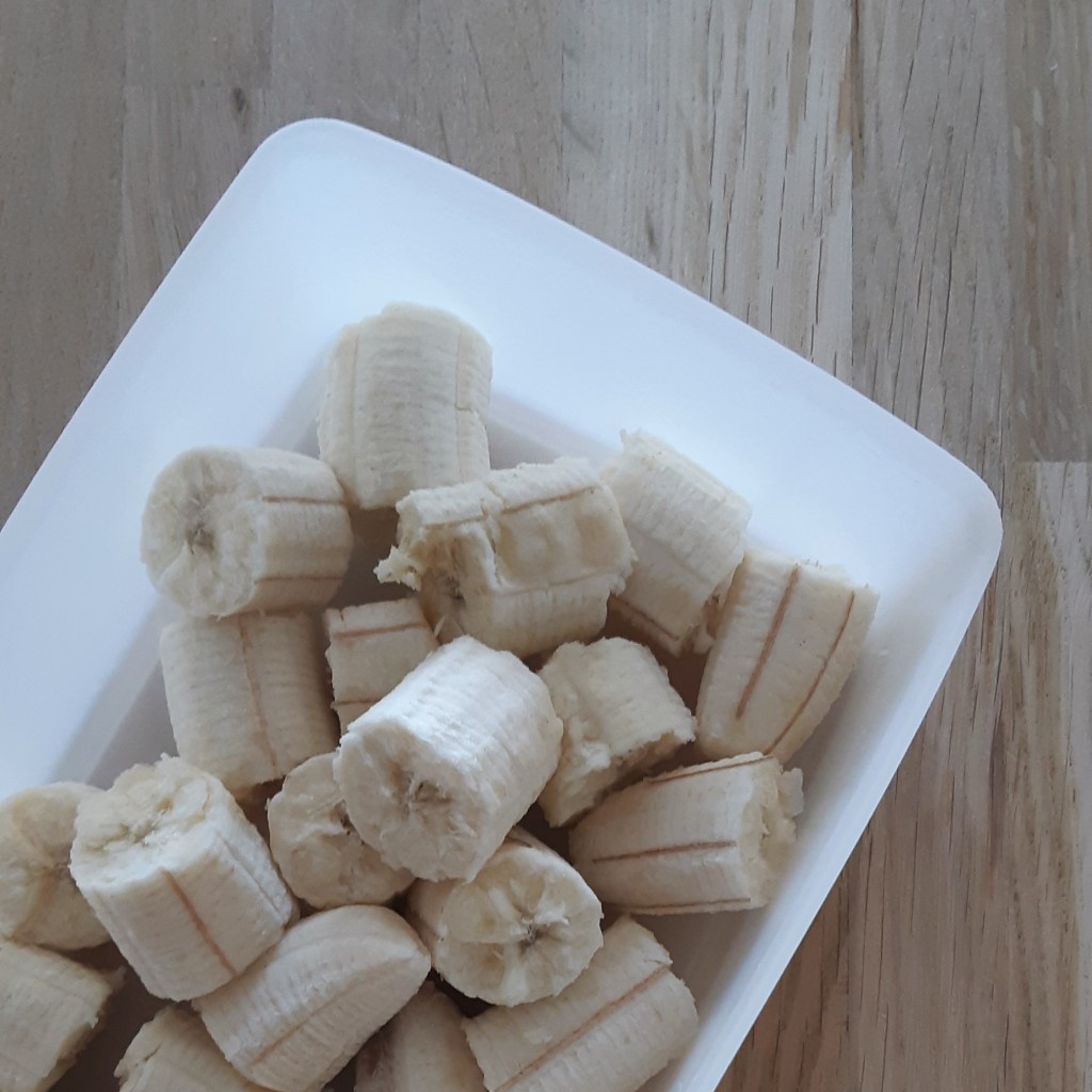 - La veille, épluchez les bananes et coupez-les en morceaux dans un plat hermétique. Placez-le dans le congélateur et laissez-le toute une nuit.