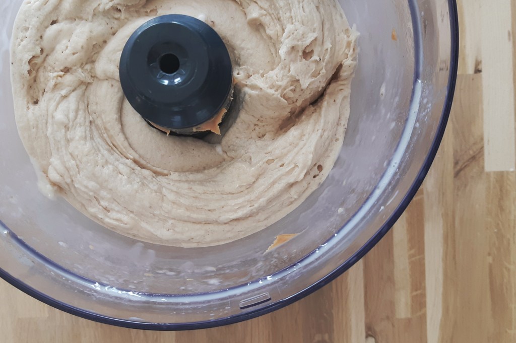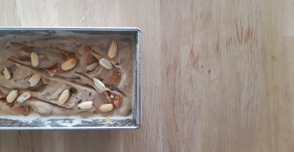 - Déposez la crème dans un plat et nappez le dessus de beurre de cacahuète puis zébrez la surface à l’aide d’un couteau.