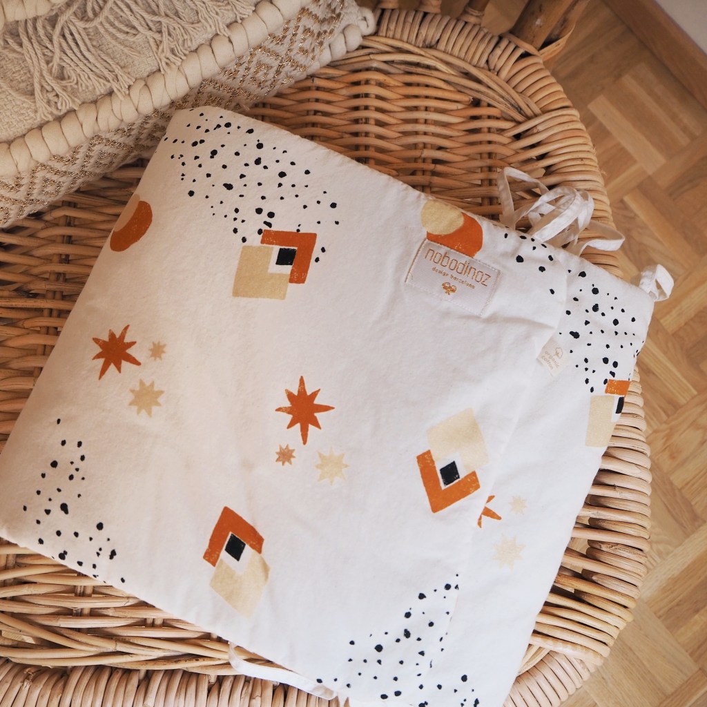 Matières naturelles. Essayer d’acheter moins mais mieux. Comme ce mobile musical & ce tapis d’éveil en coton biologique de chez Nobodinoz et cette arche d’activité de la marque Childhome en bois de hêtre naturel sur laquelle j’ai attaché des petites figurines en feutrine faites main. Définitivement, les belles matières sont un de mes points faibles.